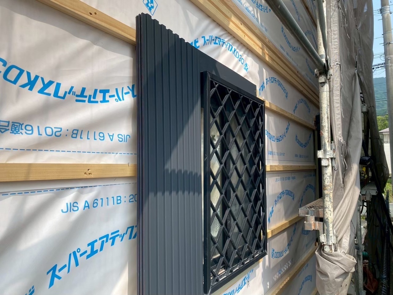 通気工法にするため透湿シートを貼って胴縁の施工です。