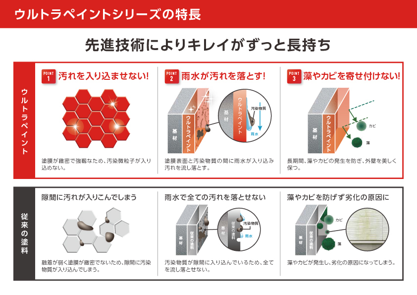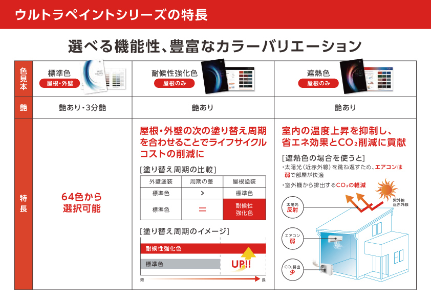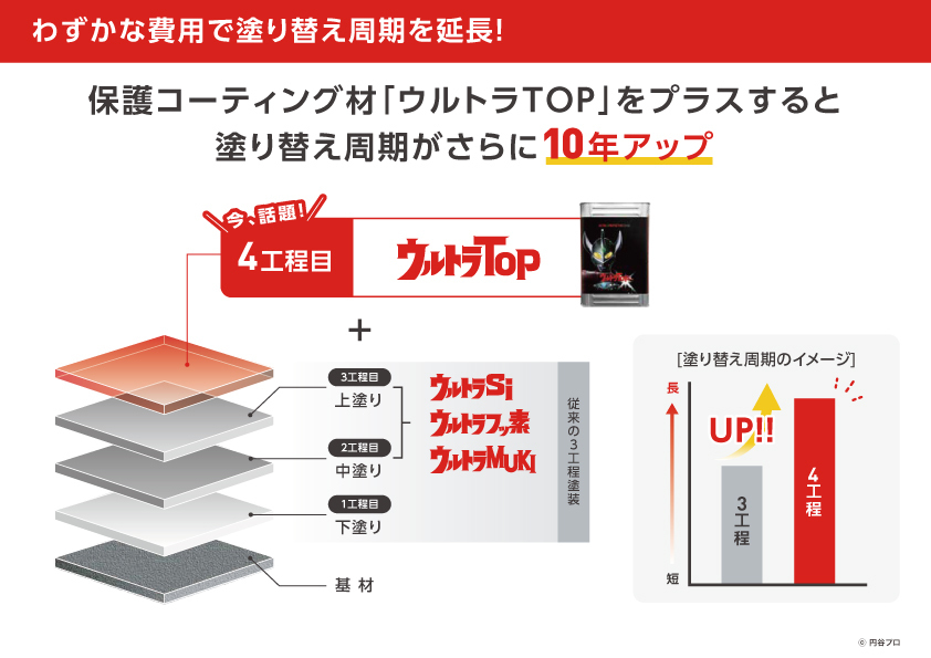 トップコートに専用トップコート材のウルトラTOPを塗布することにより、塗膜の耐候性、耐久性を高め、期待耐用年数の延長を可能にします。