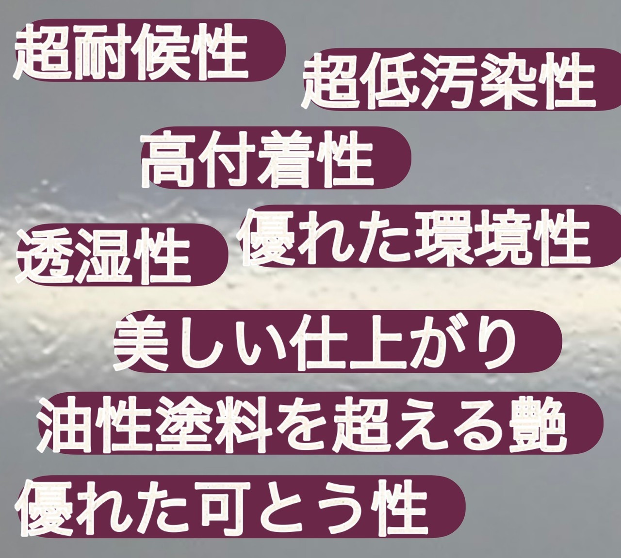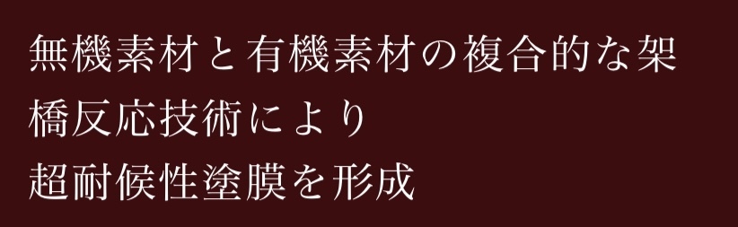 水溶性の柔軟性や油性塗料の付着性を兼ねそろえた超耐候性塗膜となっています。