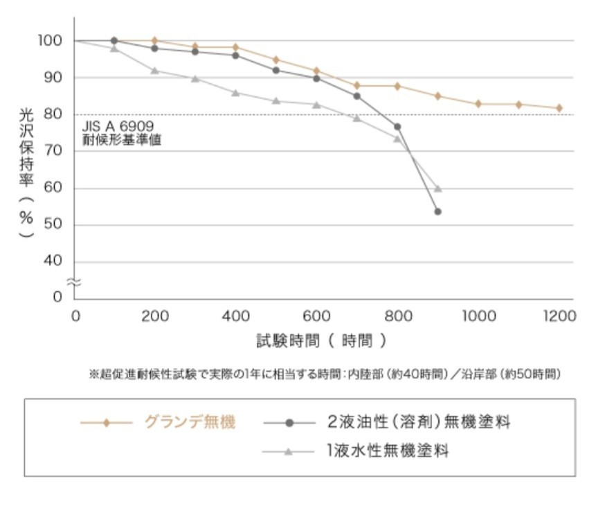 水溶性溶剤のグランデ無機は劣化点が明確な水性や油性の無機塗料に比べて緩やかな劣化進度で、性能を長く維持します。