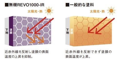 無機REVO1000-IRは、日射反射率が高い遮熱顔料を採用。一般的な顔料より熱を吸収しにくい【特殊遮熱無機顔料】で調色することで濃色でも高い遮熱性を発揮する。