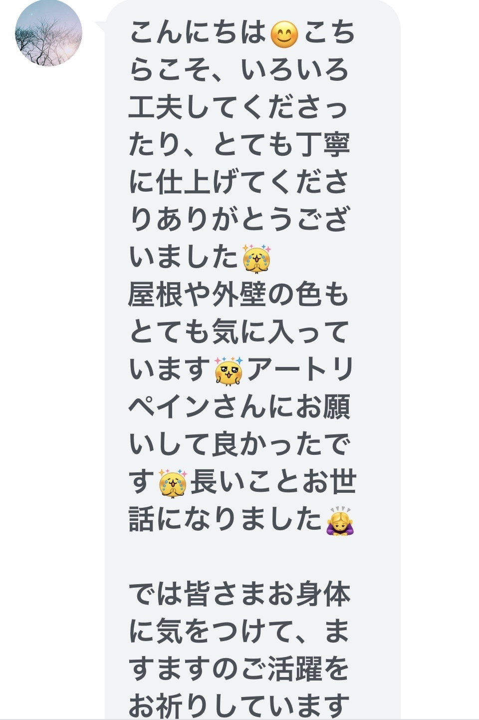 前回の塗装工事でつらい目にあったそうですね。下地処理をしっかりした上に塗装しましたので、これで安心です。いつもラインでは奥様から嬉しいお言葉を頂戴しました。家の事はアートリペインさんにお願いします!と何よりの感謝です。