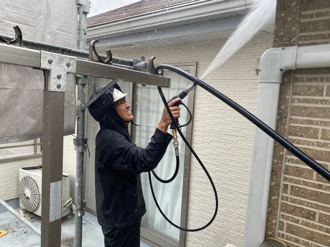 ほこりや旧塗膜を洗い流す作業ですがしっかり洗うことで塗料の密着が大きく変わります。