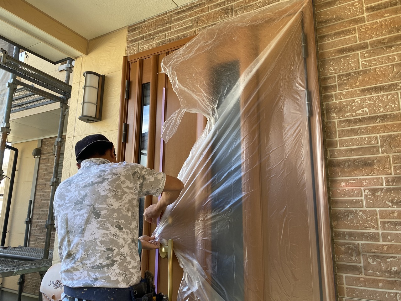 サッシ、玄関まわりなど汚れてはいけない部分はビニールで養生をします